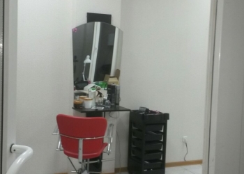 Кожаное кресло красного цвета , зеркало . И тумба для принадлежностей .
